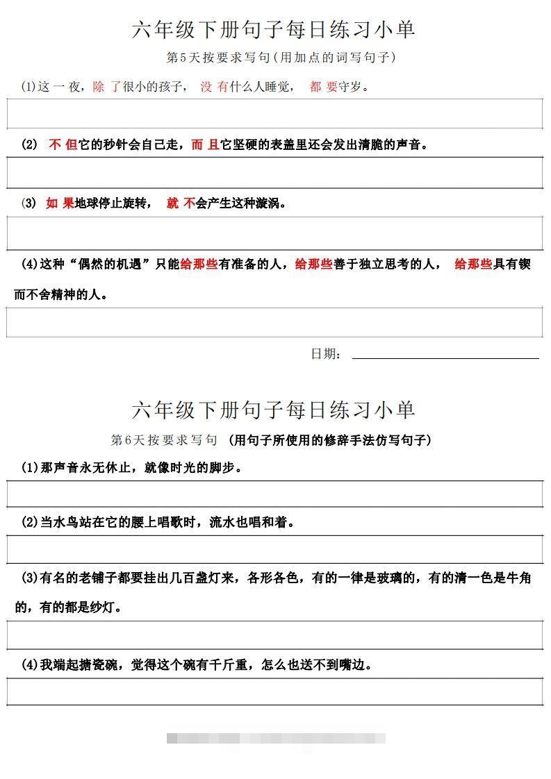 6年级语文下册每日句子练习单小梦的小妹1年前发布关注私信0566 百度已收录6年级语文下册每日句子练习单此内容为付费资源,请付费后查看会员专属资源黄金会员免费钻石会员免费您暂无购买权限,请先开通会员开通会员类型Pdf页数11 页大小2.21 MB付费资源已售 562 预览已结束,还剩8页未读,下单本商品后可免费下载高清完整文档 © 版权声明 版权声明 1 本网站名称:梦帆创业网 2 本站永久网址:https://www.mfchuangye.cn/ 3 本网站的文章部分内容可能来源于网络,仅供大家学习与参考,如有侵权,请联系站长 QQ185599521进行删除处理。 4 本站一切资源不代表本站立场,并不代表本站赞同其观点和对其真实性负责。 5 本站一律禁止以任何方式发布或转载任何违法的相关信息,访客发现请向站长举报 6 本站资源大多存储在云盘,如发现链接失效,请联系我们我们会第一时间更新。 THE END小学语文 喜欢就支持一下吧点赞6 分享QQ空间微博QQ好友海报分享复制链接收藏