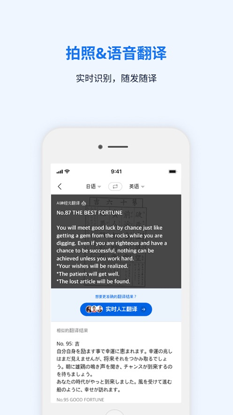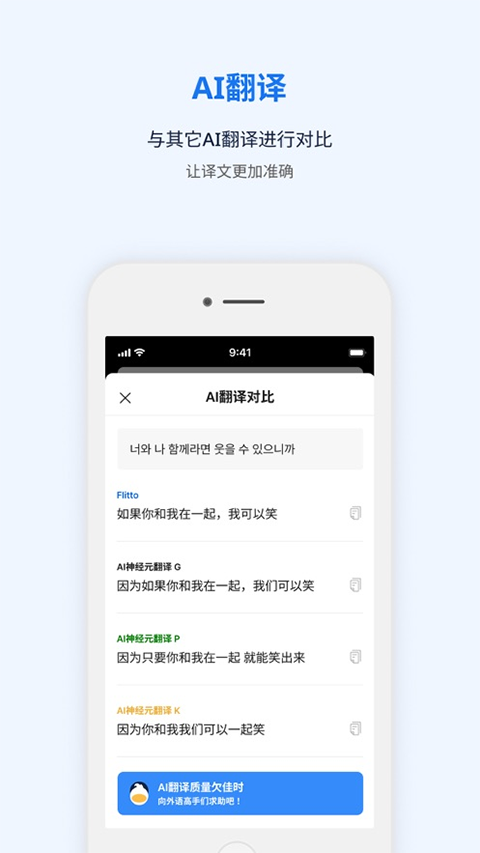 基于AI神经元网络,结合数亿级高质量语言数据优化算法,致力提供自然、地道的翻译结果。