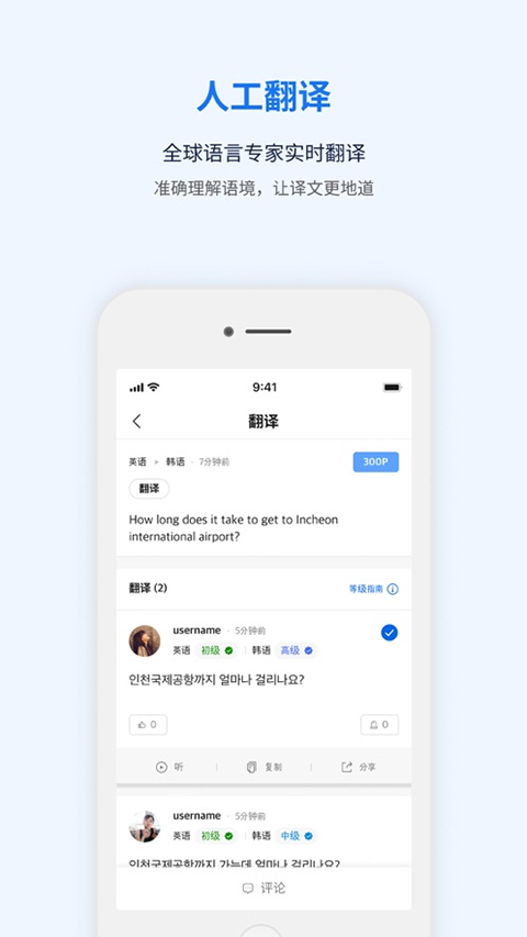 人工翻译(众包互助翻译),是由Flitto翻易通打造多年的全球化翻译平台。语言专家遍布全球173个国家,像发消息般简单,平均3分钟就能收到人工译文。