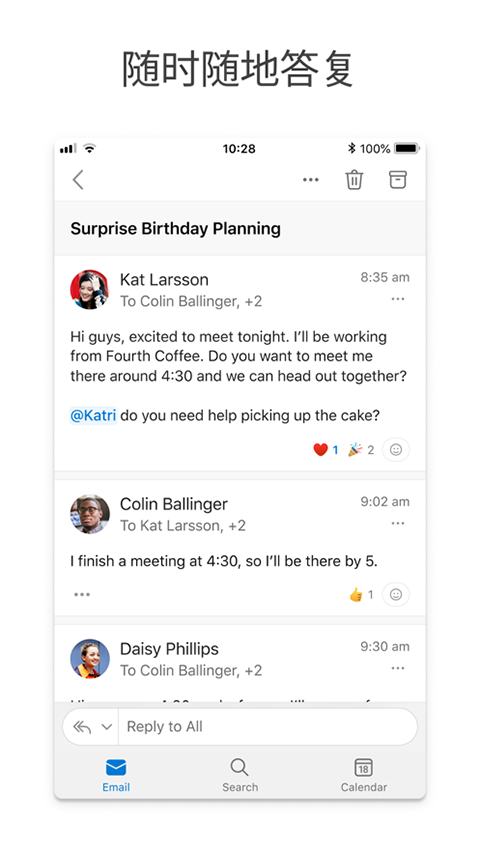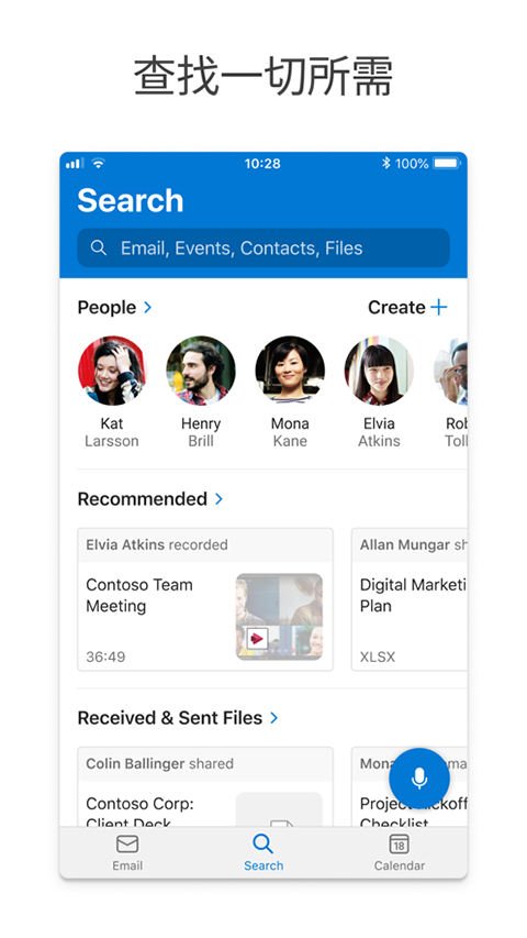 – 利用全新的搜索体验,找到所需的一切内容,包括文件、联系人和接下来的行程。
