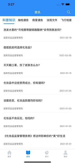 1、监管科普:各类化妆品相关的科普知识、公告通告、监管动态、飞行检查、法规文件信息