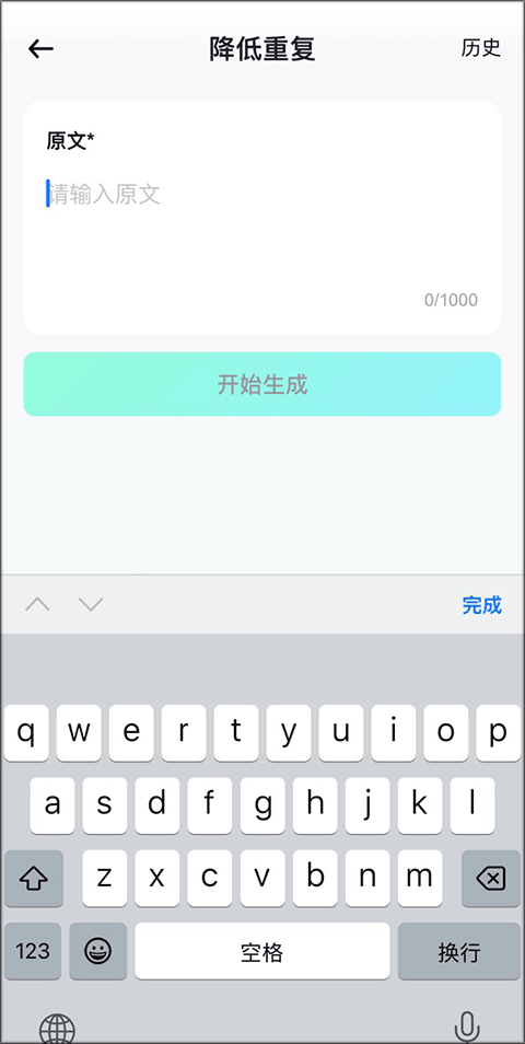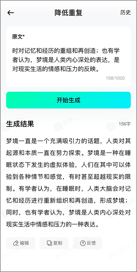 2、粘贴想要降重的字段或文章,点击“开始生成”。