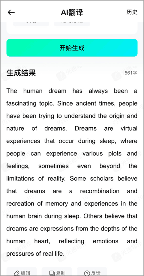 2、输入想要翻译的内容,选择语言,点击“开始生成”。