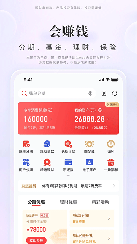 随意购、轻松分,缓解还款压力,远离剁手;长、中、短期借款满足各种资金需要,新增无卡借款,无中信信用卡也能申请
