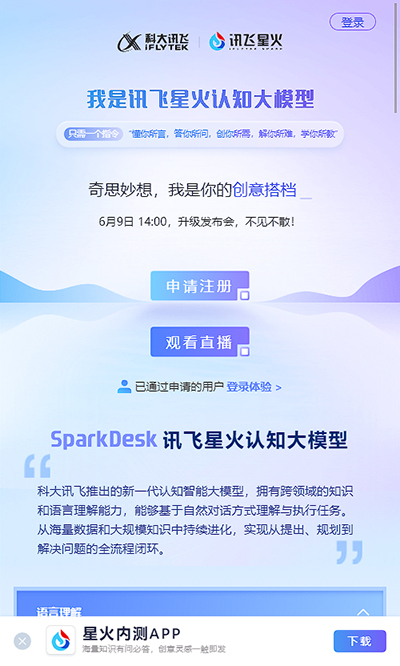 1、打开讯飞星火官网(https://xinghuo.xfyun.cn/),点击下方的申请注册按钮