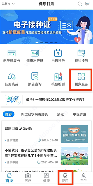 1、进入“健康甘肃APP”,点击“更多服务”, 或是“便民”