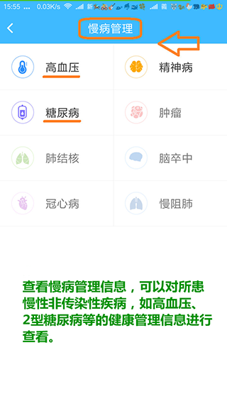 8、查看慢病管理信息,可以对所患慢性非传染性疾病,如高血压2型糖尿病等的健康管理信息进行查看。