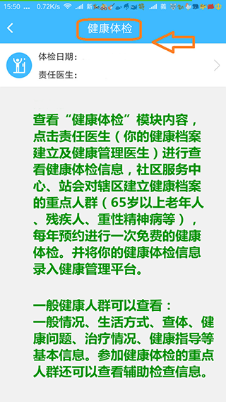 点击责任医生(你的健康档案建立及健康管理医生)进行查看健康体检信息,社区服务中心、站会对辖区建立健康档案的重点人群(65岁以上老年人、残疾人、重性精神病等),每年预约进行一次免费的健康体检。并将你的健康体检信息录入健康管理平台一般情况、生活方式、查体、健康问题、治疗情况、健康指导等基本信息。参加健康体检的重点人群还可以查看辅助检查信息。