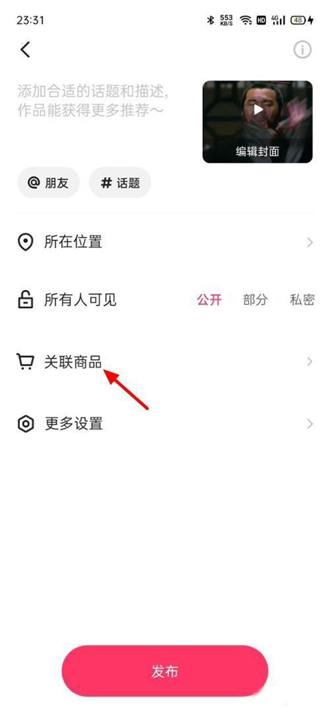 2、进入到作品发布界面,选择“关联商品”小黄车选项,