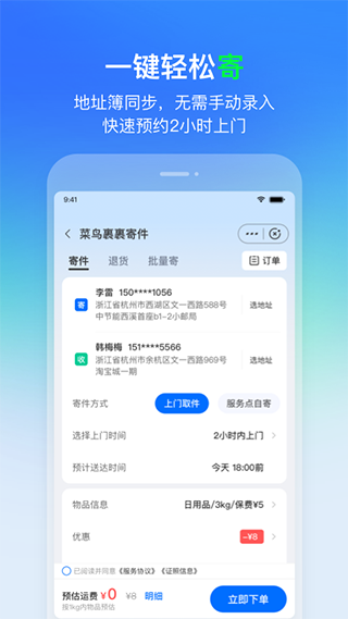 足不出户就能轻松寄包裹,一键呼叫快递员,2小时上门服务;同时支持淘宝、天猫、闲鱼运费险商品免费退货,购物达人们从此任性买无忧退。