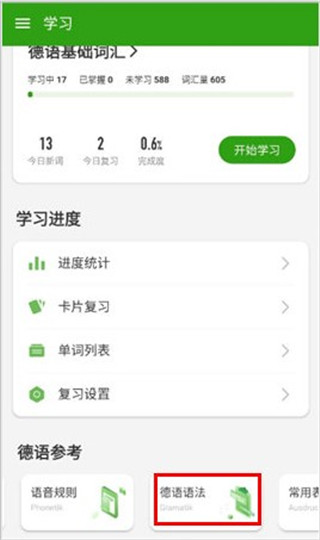 1、首先打开德语助手苹果手机版,进入学习页面,点击【德语语法】按钮。