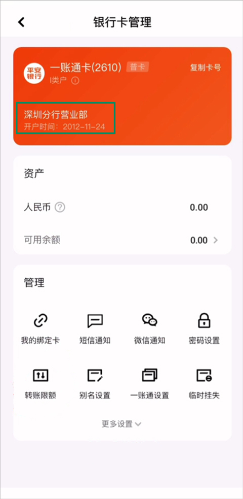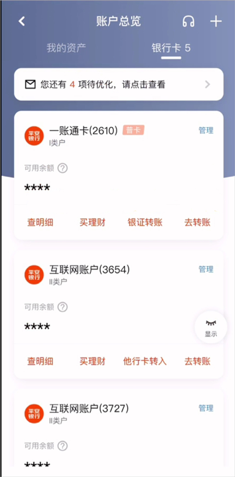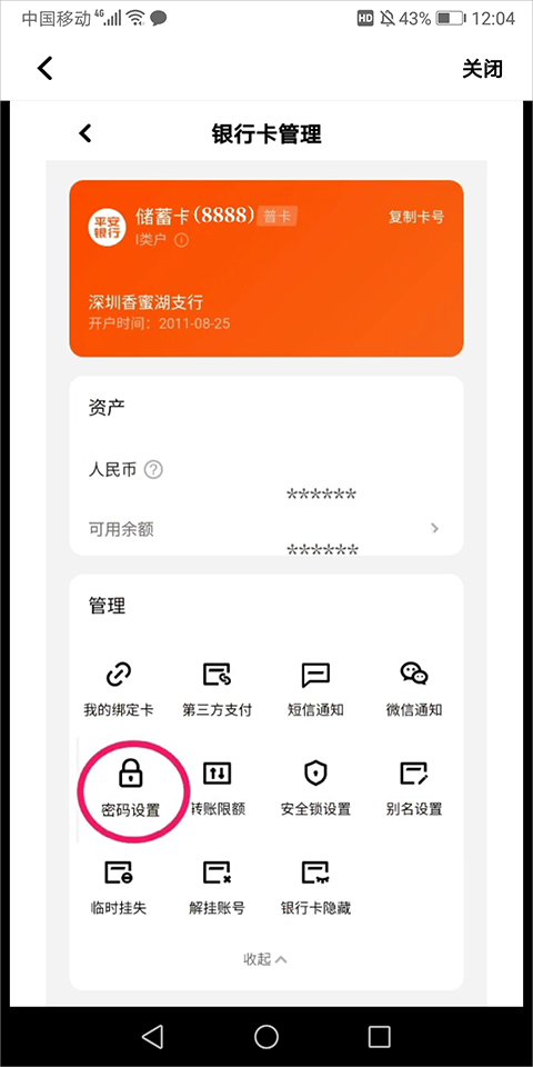 1、进入平安银行app【我的】页面中点击【账户】,在打开的新页面中选择要修改密码的卡片后点击其右侧的【管理】