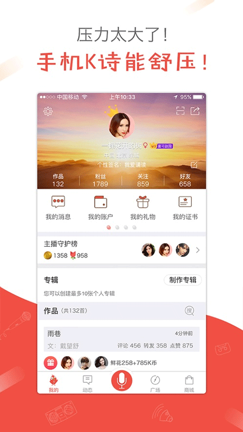 除了朗读功能外,全民K诗还拥有社交功能,用户可以在这里与其他用户互动、分享自己的作品、观看他人的表演,甚至参与线上比赛和活动,让自己的娱乐体验更加丰富和有趣,是非常值得尝试的综合性娱乐平台,感兴趣的小伙伴可以下载试试哦!