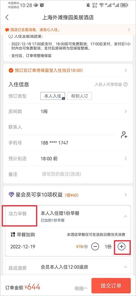2、点击预订后进入订单页面,点击活力早餐选项,然后点击右边+号进行加购早餐