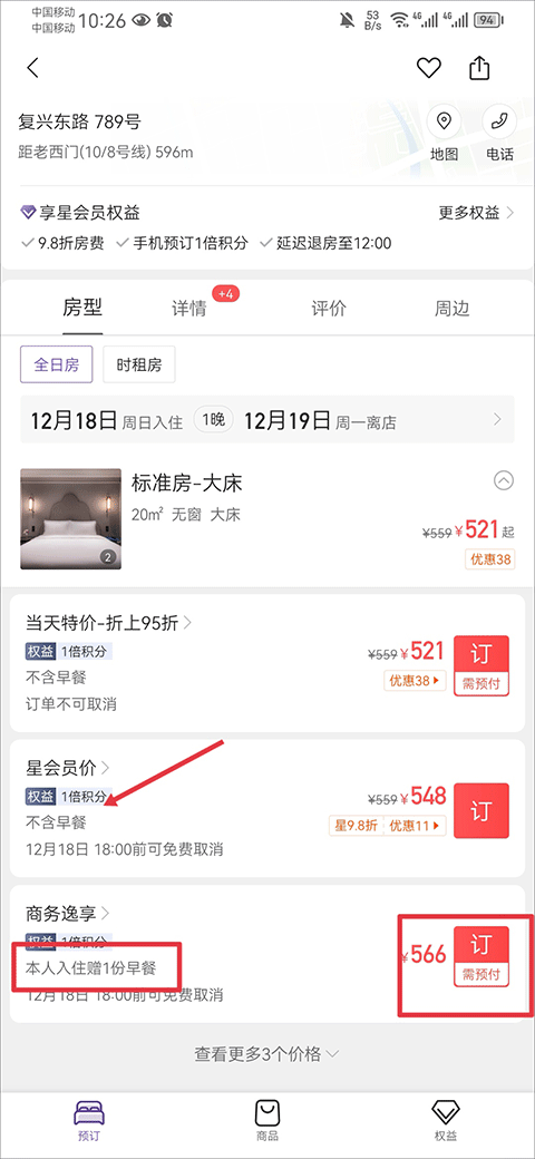 1、在酒店详情界面中,用户需要选择包含早餐的房间进行预订,不含早餐的房间是不提供加购早餐功能的