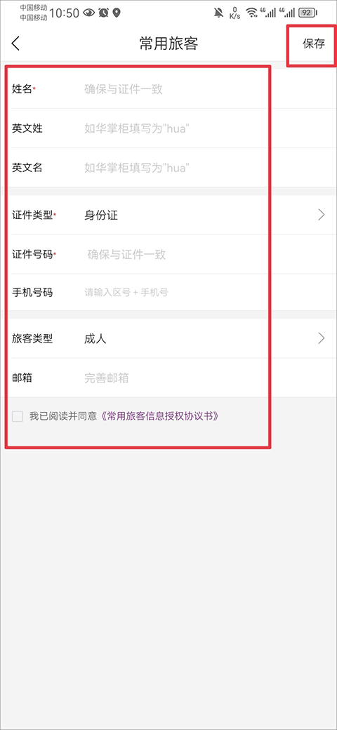 4、最后将姓名、证件号码、手机号码、旅客类型信息完善后点击保存即可添加完成