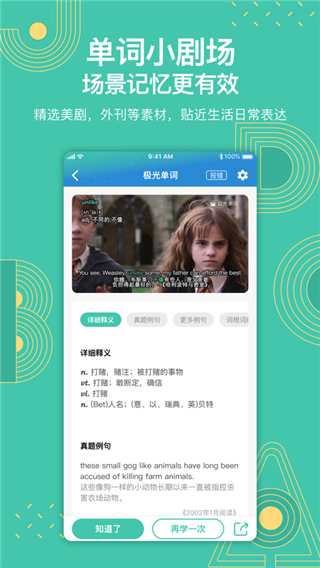 场景记忆法,地道语料,精选经典美剧《老友记》、《经济学人》等外刊新闻等学习素材,还有单词剧场,将【电影原声】+【电影画面】融合在一起,活学活用。