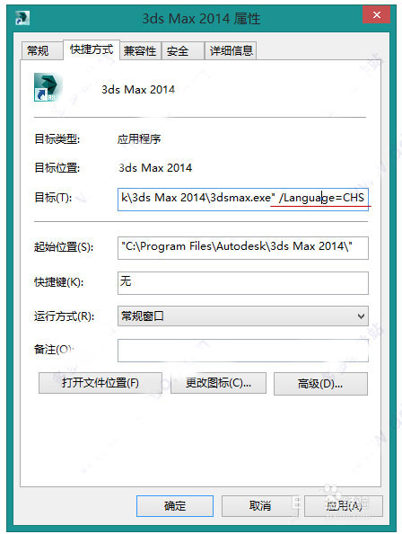 9、接下来,开始对3dsmax2014软件进行激活,因为默认安装为英文版本,可以选择属性,更改目标地址,加上/Language=CHS,即为中文版本;