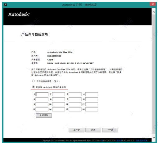 12、然后选择“我具有 Autodesk 提供的激活码”就会提示你输入16组激活码,这时打开你的3dsmax2014注册机;