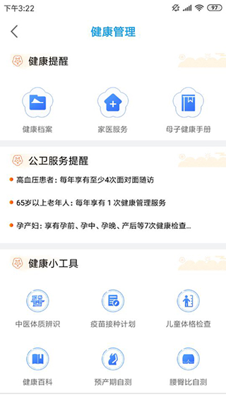 健康档案:支持居民查看个人健康档案,包括签约家庭医生信息、就诊信息、慢病随访记录以及老年人健康评估信息;