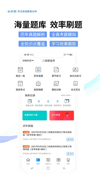 希赛题库拥有每日一练、章节练习、模拟考场、历年真题等海量试题,配备专家的答案和解析,全真模拟考场,另有错题集、收藏试题、做题记录、视频解题等,具有丰富的做题功能,随时随地可提分。