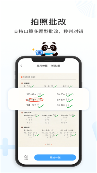 2、多题型批改:已支持口算题、竖式计算、混合运算、解方程式、脱式等题型的批改,一次拍照,整页批改。