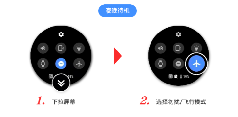 夜晚时若开启飞行模式也可以增加手表续航时间。夜晚如不使用手表,还可选择手表关机,早晨重新开机即可!