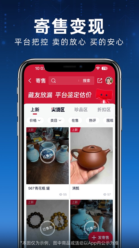 6、进入寄售界面,包括在售、尖货、上新、折扣和热评等藏友寄售的宝贝,点击感兴趣的可以详细地了解,