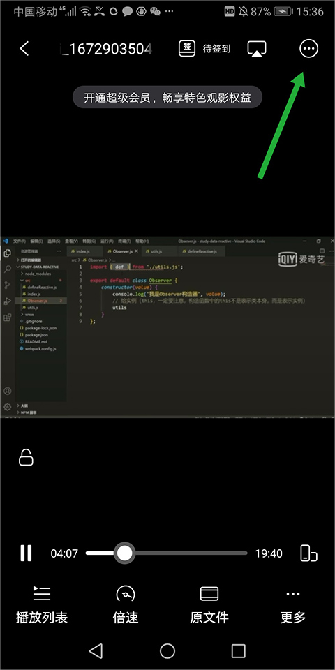 1、首先用户在阿里云盘苹果版中观看视频时点击播放页面的任意位置,接着点击右上角的扩展按钮(下图绿色箭头所指)