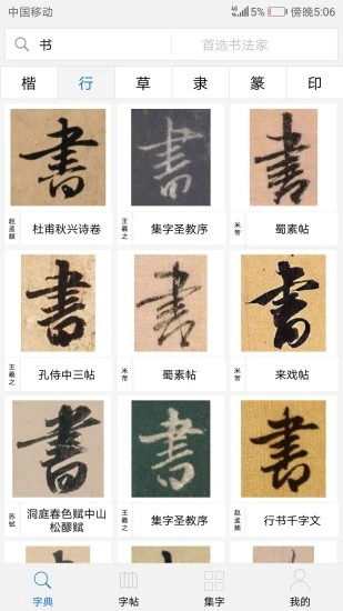 1、查询单字:列出单字在各书法家在各字帖中的写法。