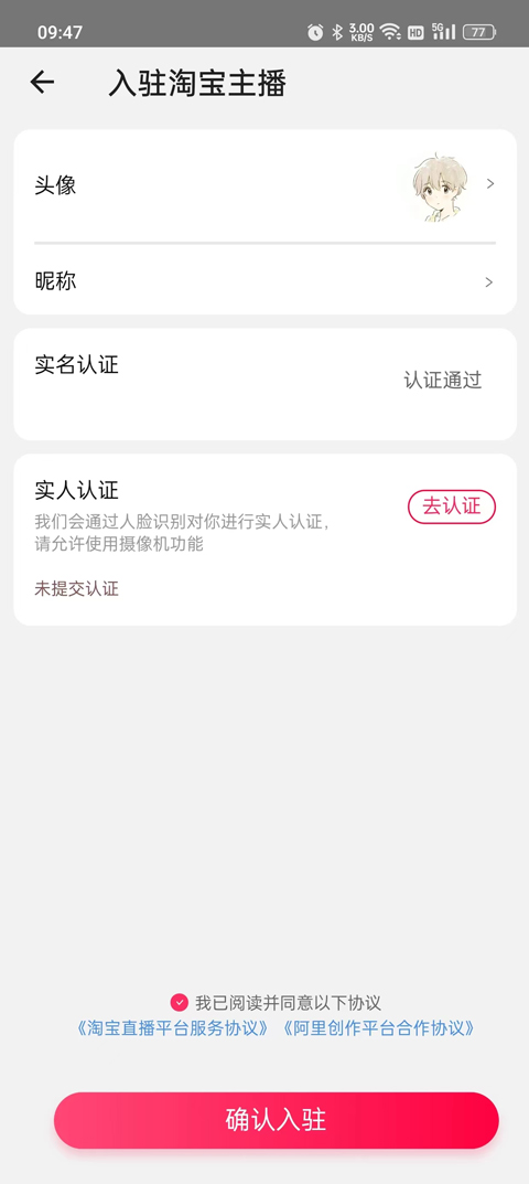 2、在首页的头像下方有一个【立即入驻】的选项,点击进入,先选择实人认证,进行人脸识别;
