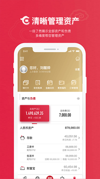 (4)“我的”模块可一目了然的为客户展示自己在华夏银行的资产净值、总资产值及负债信息,方便客户对自己的资产进行管理
