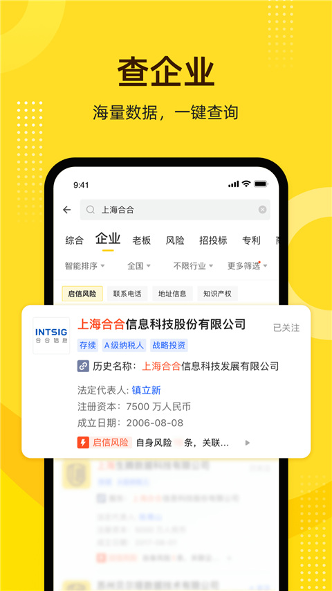 启信宝应用可以通过该应用了解企业的经营状况和信誉情况,帮助用户在商业合作和投资决策中进行更加明智的选择,为用户提供全面、准确的企业数据分析,助力用户商业决策,是各界商务人士必备的企业征信利器,并且还可以通过企业名称、人名、品牌、联系方式、网址、专利等企业信息关键字或者组合关键字多维度锁定目标企业,从而获得该企业的所有信息,有需要的朋友欢迎下载体验。