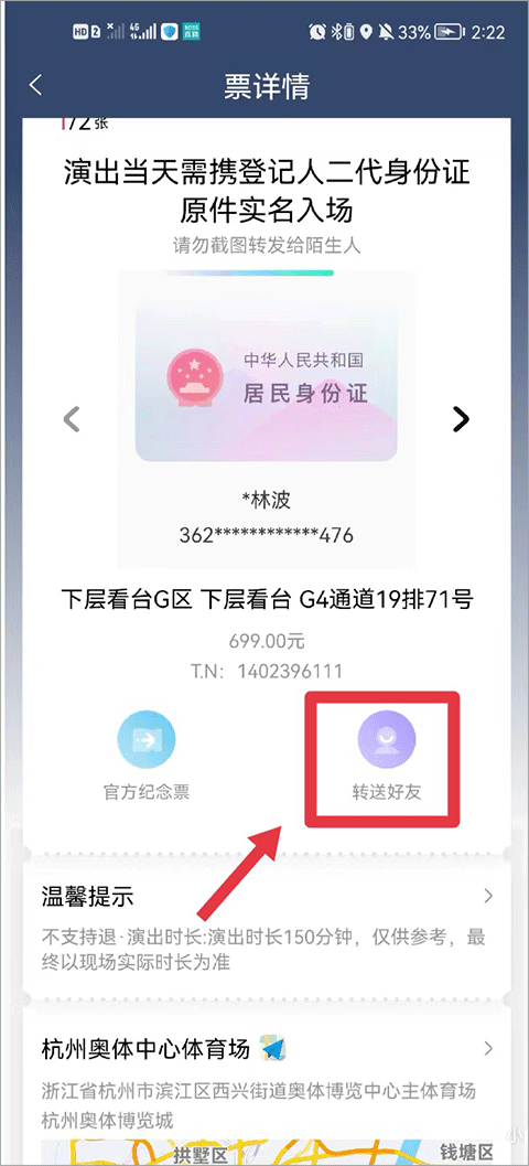 3、然后选择你要转送的票,以及接受人信息后点击转送好友;