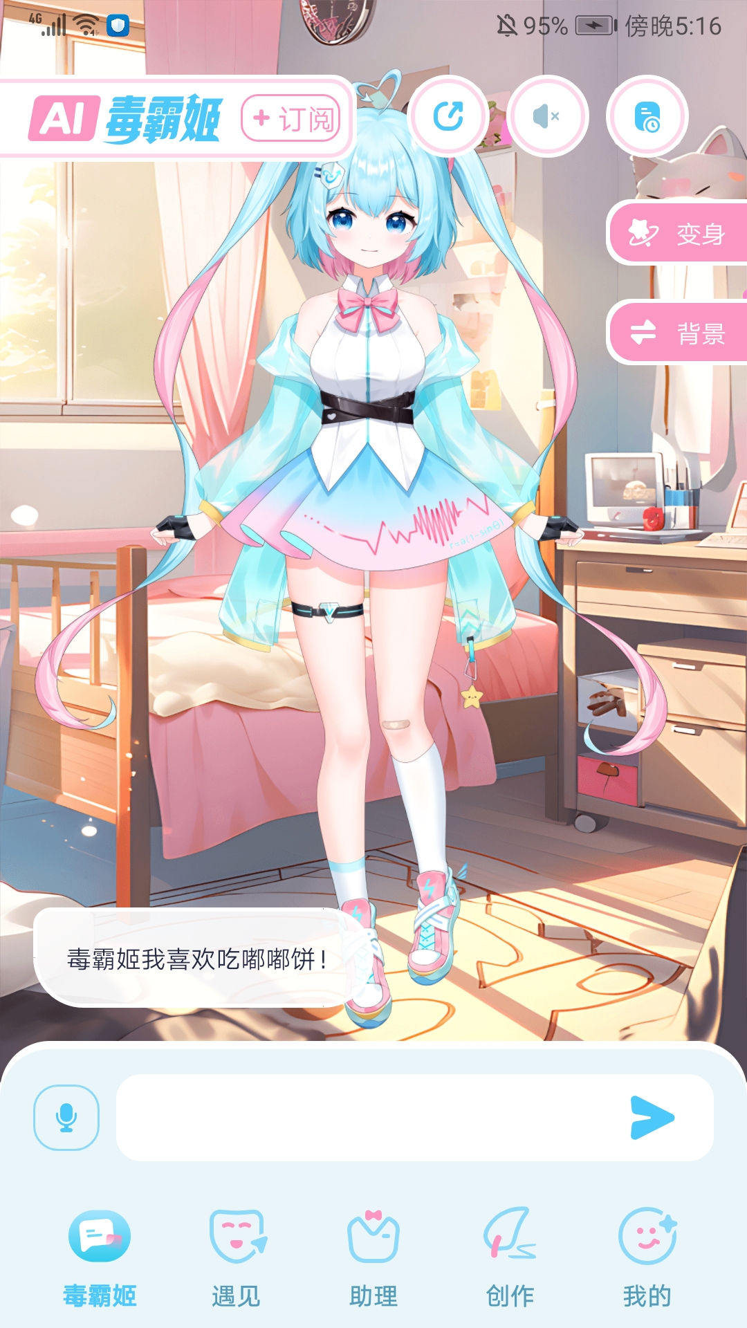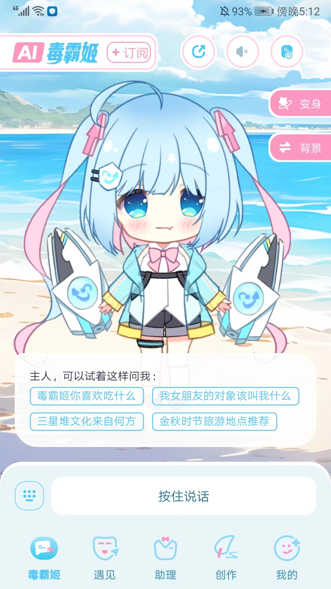 1、打开毒霸姬免费版,进入应用主界面,可看到包括【毒霸姬】、【遇见】、【助理】、【创作】和【我的】频道,在当前频道我们可以通过语音和打字和毒霸姬对话,