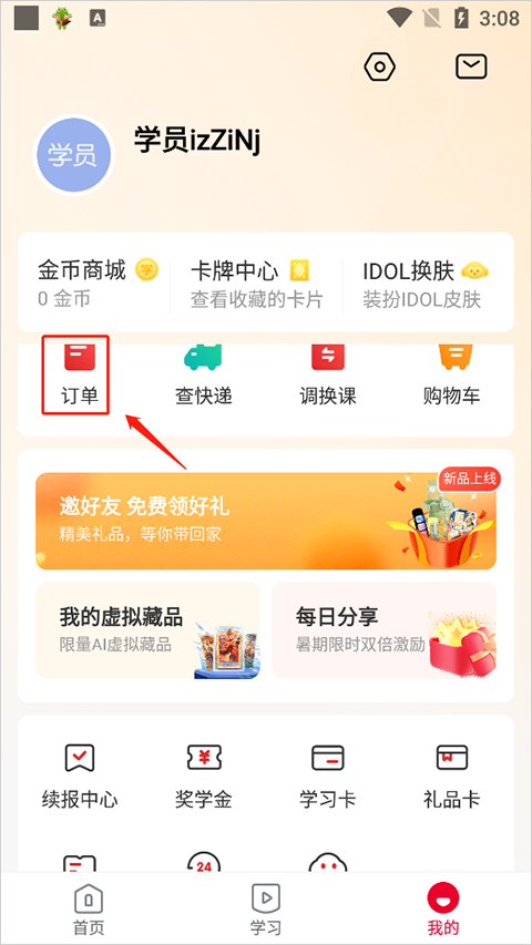 2、在“我的”个人信息界面中选择“订单”功能选项。