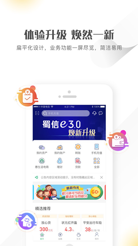 四川农信app苹果版是四川省农村信用社为个人客户量身打造的苹果手机银行,该软件将互联网与传统电子银行进行深度融合,集“支付转账、融资贷款、投资理财、生活服务、社交娱乐”五大业务板块于一体,品牌名为“蜀信e”。通过深入挖掘新型农业经营主体和城乡居民生产、生活过程中的多种需求,从客户体验出发,搭建起四川农信的“线上银行”和“移动银行”,形成了“平台金融”的业务模式。