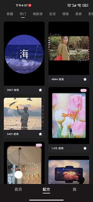4、在配方里面点击电影感,使用里面的模板可以让你也能拍出好莱坞电影大片的既视感;