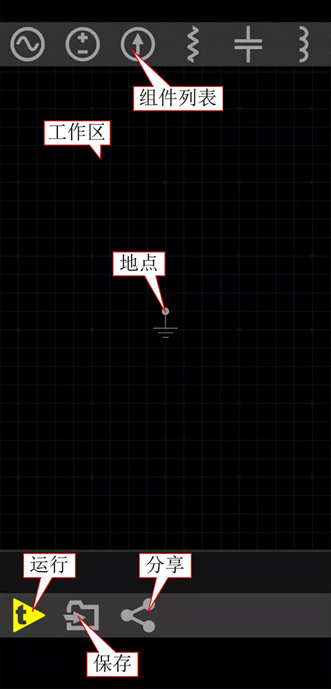 第一步:点击新建按钮,建立新的文件。中间是工作区;最上面是组件列表,提供了丰富的元件,滑动组件列表可以找到需要的元件;“地点”默认在工作区内固定的位置,设计电路时我们尝试围绕它进行电路设计。