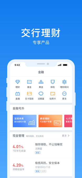 交通银行苹果app是一款功能非常丰富的掌上交通银行客户端软件,由交通银行官方为苹果手机用户而打造,软件集转账、查询、理财、基金、证券、黄金、外汇、支付、信用卡等众多功能于一身,可为省去去实体营业厅办理各种金融业务的麻烦,不过软件还是支持线下预约的服务,当你要去办理重要事务时可以通过它提前预约。另外,软件提供了一站式生活服务,吃喝玩乐样样方便,包含预订酒店、景点购票、购买电影票、生活缴费等服务,还支持多种线下付款方式,掏出手机便可支付,让你在轻松完成付款。除此之外,交通银行手机银行app还有便携式理财投资服务,例如转账、余额查询、收支明细查询,以及各种高收益的投资理财产品,让你随意选择,有喜欢的朋友不要错过了,赶紧来下载吧~