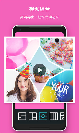 2、视频拼贴:迅速拼出质感视频,音乐、文字、边框等工具都支援