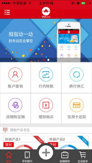 1、基础服务:账户一览、交易明细、智能转账、理财购买、智能储蓄、基金购买、个人贷款、信用卡、资金归集、网点预约;