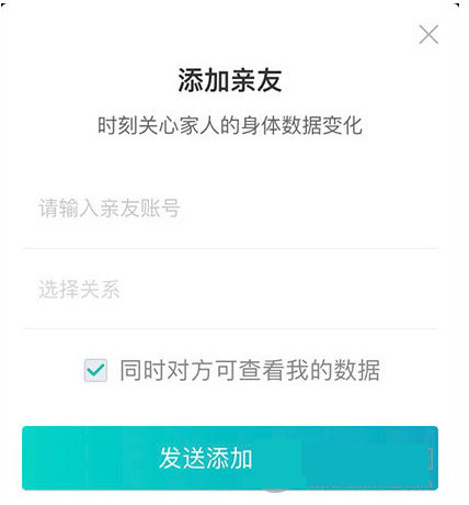 第三:输入自己亲友的账号,并且选择亲友关系,再发送请求,等亲友通过了请求之后就可以看到亲友的身体数据了。