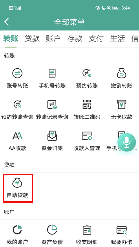 2、然后,在全部菜单中找到并点击“自助贷款”选项;
