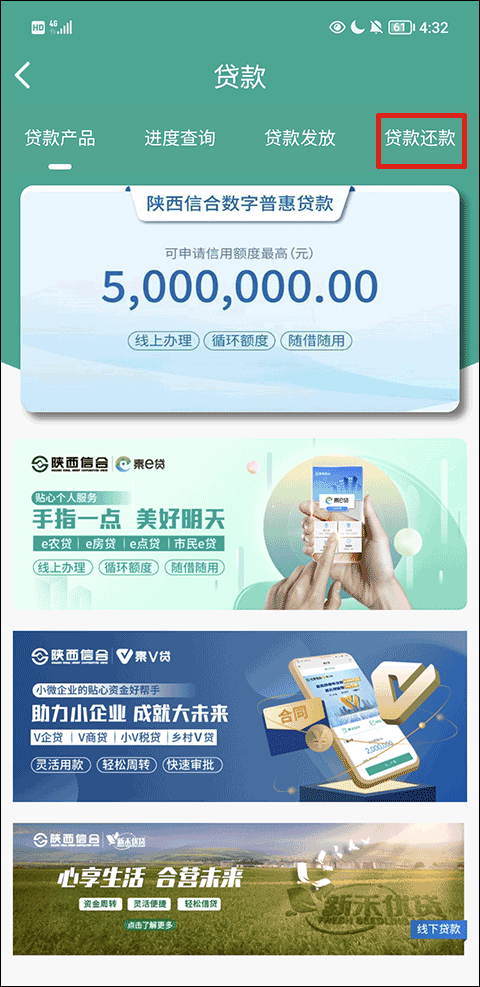 3、现在在贷款界面找到并点击“贷款还款”选项;