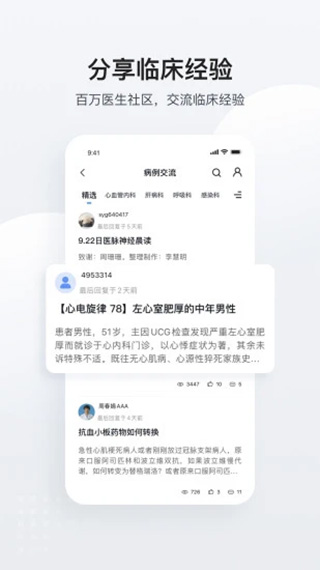 疾病诊疗方法、科室典型病例,疑难病例在线分享,临床医生讨论教学指导,医生社群辅助学习。