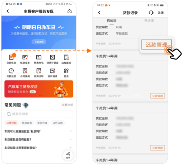 1、首先用户需要提前在口袋银行app上进行预约,进入口袋银行搜索【车贷专区】找到【车贷客户服务专区-贷款信息-还款管理】