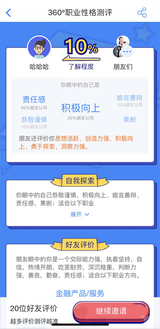第二,360度测评。大学以前,学生的终极目标就是高考,很少有考生认真思考过自己适合做什么,未来的职业方向在哪里。“完美志愿”提供MBTI性格测试、霍兰德兴趣测评,能帮助学生清晰认知自身性格优势以及兴趣倾向。考虑到自我评价可能存在较强主观成分,“完美志愿”还有“他评”功能,让学生的父母、亲朋好友对学生进行评价,分析出更真实客观的性格特征,从而更准确地推荐对口专业和职业方向。