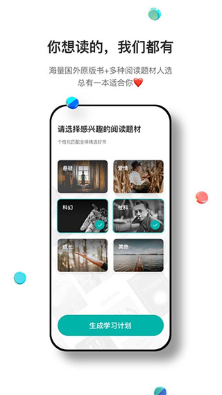 根据用户实际的英文水平匹配适合其阅读的书单,真正实现 i+1 学习理念。