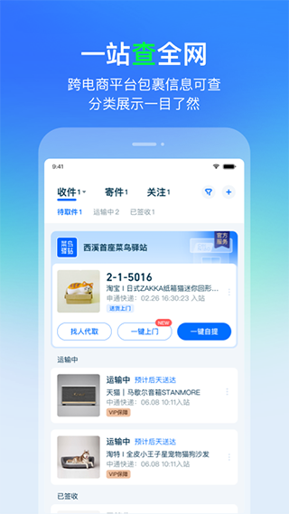 一个地方,查全网包裹,你再也不用担心散落在各个电商网站的包裹状态,包裹行踪轻松掌握。